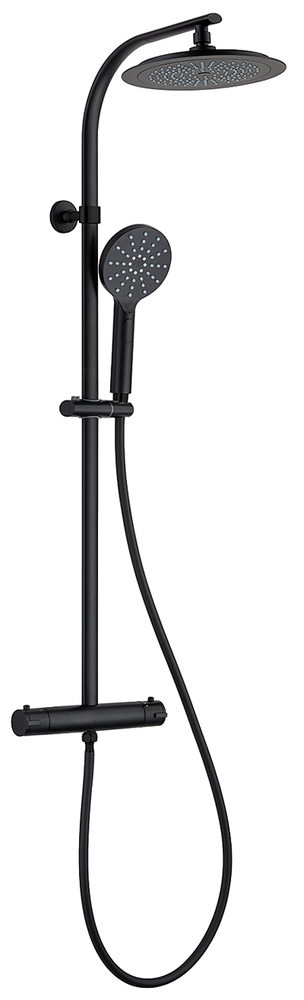 Die Trendfarbe schwarz matt für Exklusivität und Individualität in Ihrem Bad und Ihrer Dusche: Dieses Komplett Duschsystem mit Thermostatarmatur und runder, großer Kopfbrause wird einfach und schnell mit den genormten Anschlüssen des Thermostats in Ihrer Dusche an den vorhandenen Rohrleitungen für die Duscharmatur montiert. Eine variable Wandhalterung ermöglicht die Nutzung vorhandener Bohrlöcher. Eine komfortable Thermostatarmatur mit Sicherheitssperre gegen Verbrühen bei 38° C., die flache, bewegliche Kopfbrause und die komfortable, in Höhe und Neigung verstellbare Handbrause mit den fünf Strahlarten garantieren Ihnen immer wieder hohen Duschkomfort bei einfacher Handhabung. Doch nicht nur die Technik und die hochwertige Ausstattung und Verarbeitung der Regendusche überzeugen, sondern ebenso die moderne und elegante Optik in mattem schwarz.