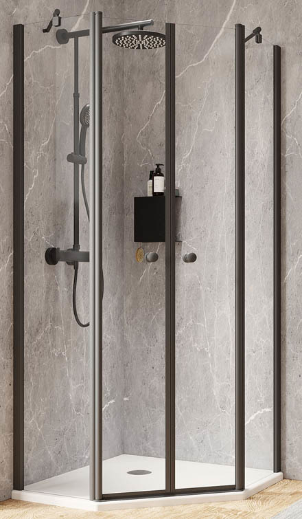 Produktbeschreibung Schulte Garant 2.0 Fünfeckdusche 4-teilig mit Pendeltüren 2000x900x900 mm, 6 mm Echtglas Klar hell, Profilfarbe matt schwarz: