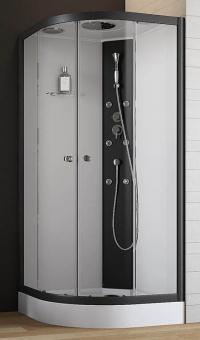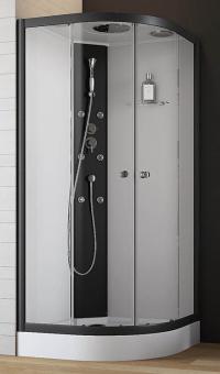 • Inklusive schwarz mattem Paneel mit Einhebelmischer, Steuerelement, 6 verstellbaren Massagedüsen, Regendusche im Acryl-Dach, Handbrause mit 1 Strahlart, Brauseschlauch und Glas-Ablage