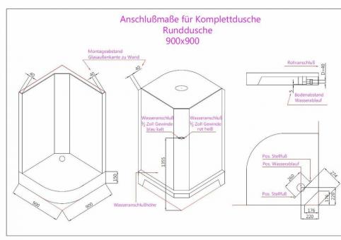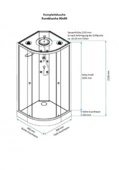 • Gesamthöhe der Komplettduschkabine: 2150 mm (je nach Anbringung der Schläuche ca. 10-20 mm höher), Profilhöhe: 1935 mm; Tiefe 900 mm, Breite 900 mm
