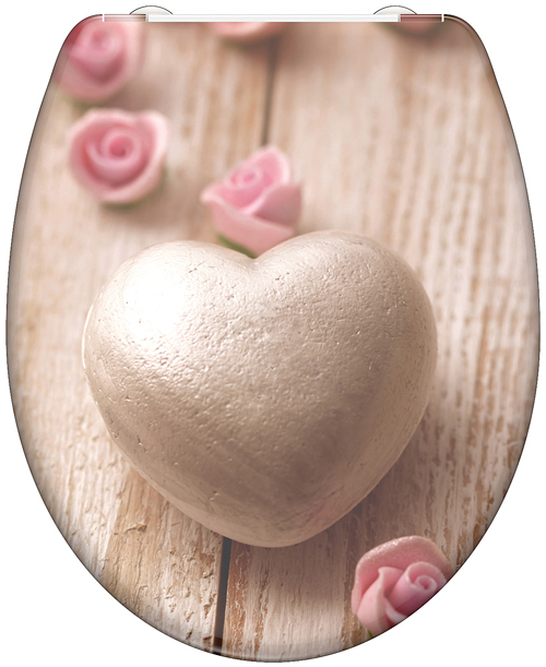 Dieser 3-seitig mit dem Motiv Romantik bedruckte WC-Deckel aus Duroplast bringt nicht nur Farbe in Bad und Toilette, sondern ist auch hochwertig ausgestattet mit Absenkautomatik, Schnellverschlusstechnik und einer verstellbaren Befestigungstechnik für eine variable Montage. Neu auch die innovative Befestigungstechnik mit einer zusätzlichen Sicherung mit Klebepads, so dass es kein Verrutschen des WC Sitzes mehr gibt. Der WC-Sitz überzeugt darüber hinaus auch mit seinem guten Sitzkomfort. Duroplast WC-Deckel sind robust, bruchstabil, widerstandsfähig gegen Kratzer unter haushaltsüblichen Bedingungen und lassen sich aufgrund einer porenglatten Oberfläche auch einfach reinigen; das Material gilt als hautfreundlich. Die universelle Passform lässt eine Montage des WC-Sitzes auf so gut wie allen handelsüblichen Wand-WCs und Stand-WCs zu; die Montage erfolgt einfach von oben.